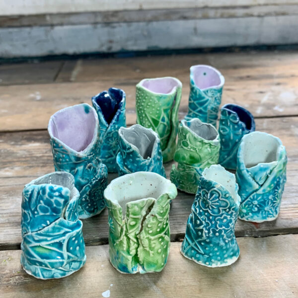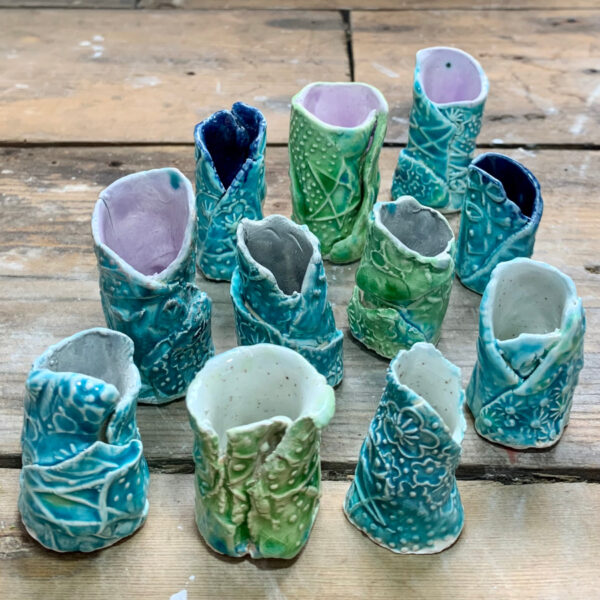My mini spill vases are created using twists of thin textured, earthenware dragon skin. Each vase is individually made so no two are the same.