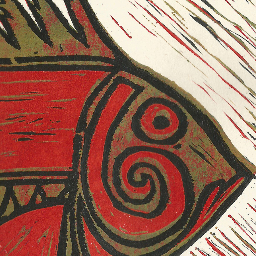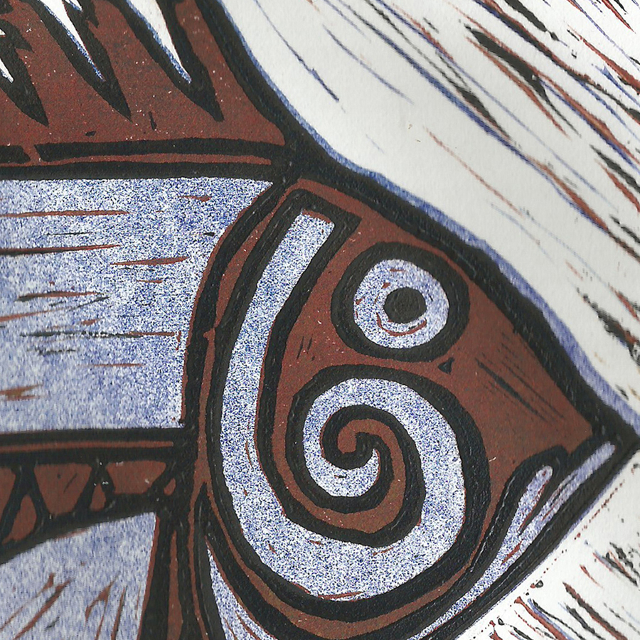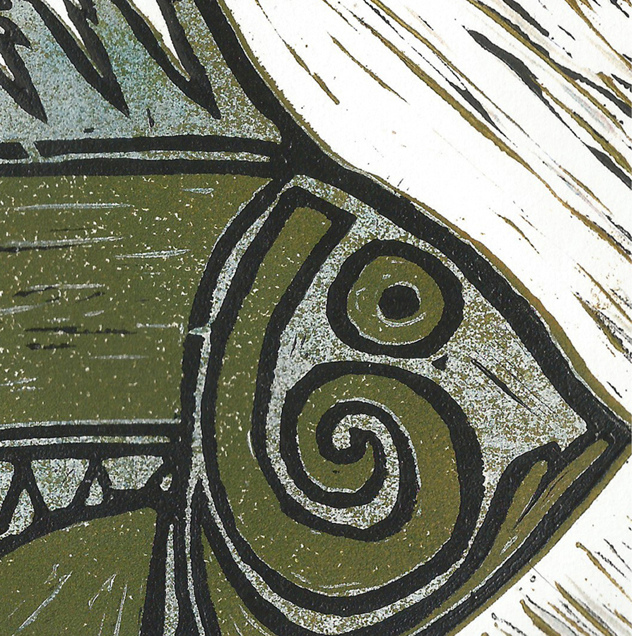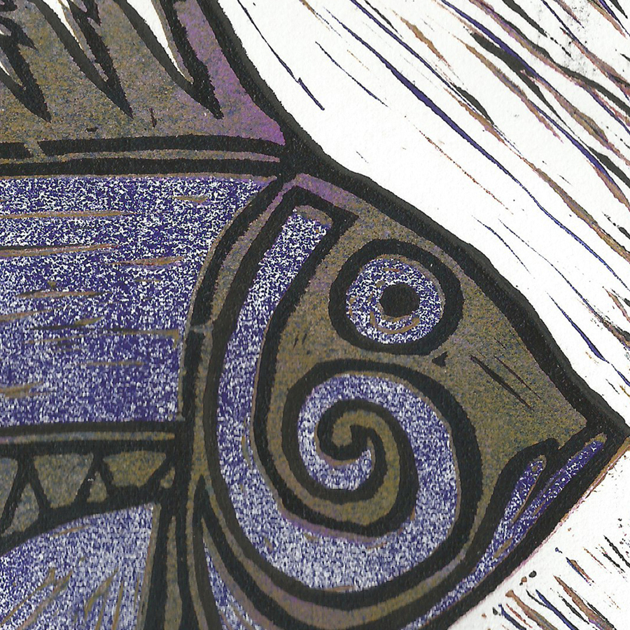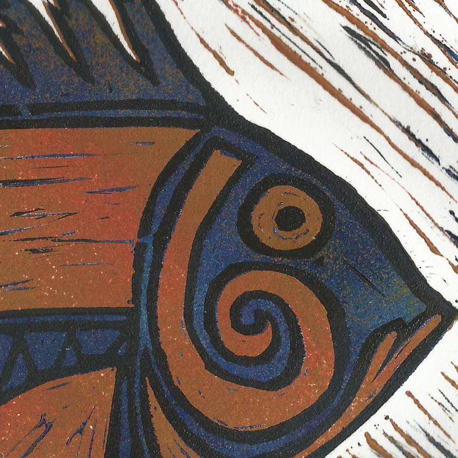 Unique, original lino-cut print of a fish. Inspired by a Japanese design. Created and printed at Burngate Stone Carving Centre on the Isle of Purbeck, Dorset.