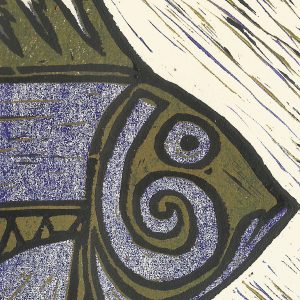 Unique, original lino-cut print of a fish. Inspired by a Japanese design. Created and printed at Burngate Stone Carving Centre on the Isle of Purbeck, Dorset.
